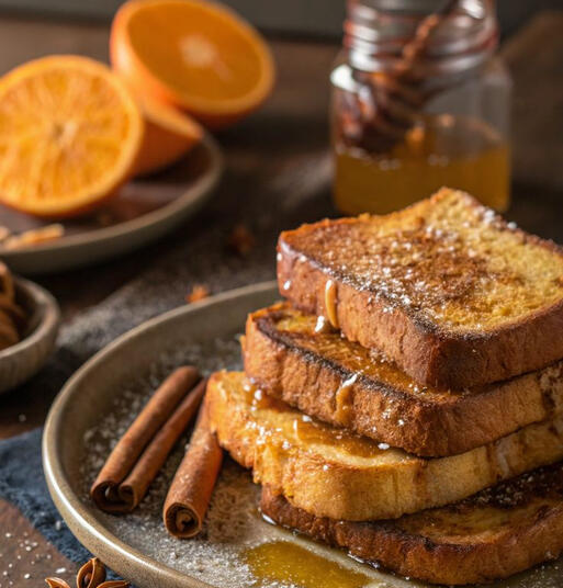 Slices of fresh bread dipped in a mix of milk and egg, and fried in butter. Served with your choice of maple syrup or fruit topping, and dusted with powdered sugar.